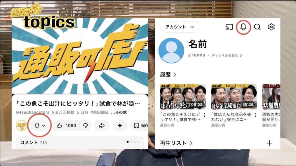 なお、本編配信のお知らせにつきましては、YouTubeの「通販の虎」チャンネルページ右上のベルマークより通知設定をオンにしていただくことで受け取ることが可能です◎ぜひチャンネル登録のうえ、配信をお待ちいただければ幸いです。
